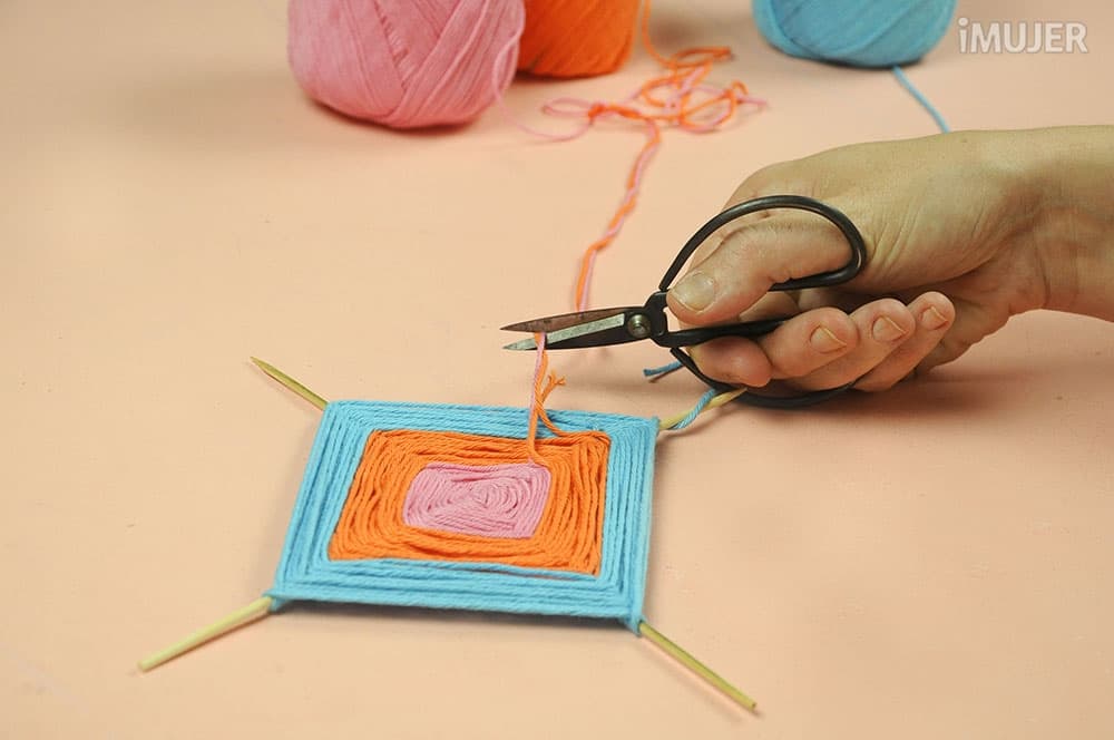 Para terminar, corta los hilos que sobraron con una tijera y sujeta bien con un nudo entre ellos.