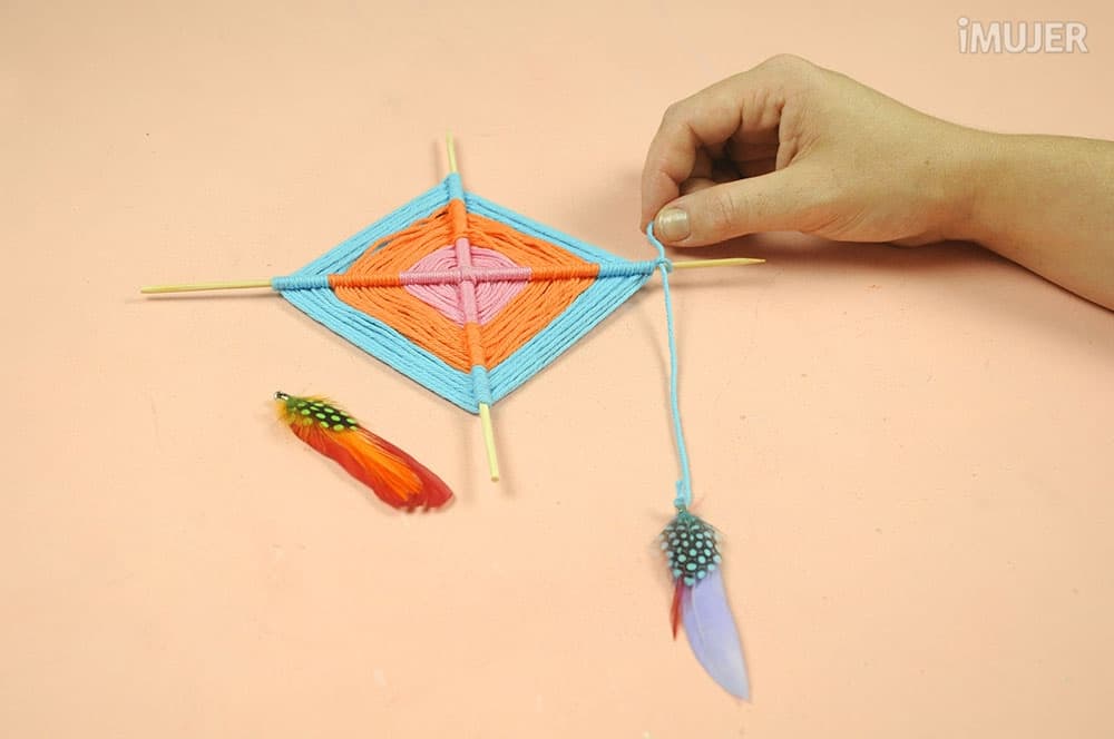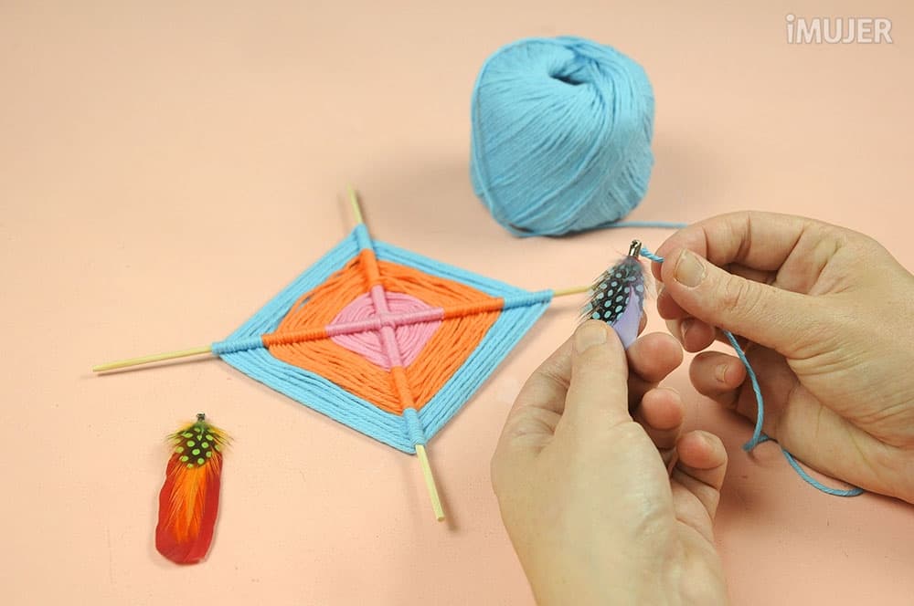 Sujeta la pluma al atrapasueños para que quede colgando y haz lo mismo con la otra. Estoy segura que te quedará súper bien.