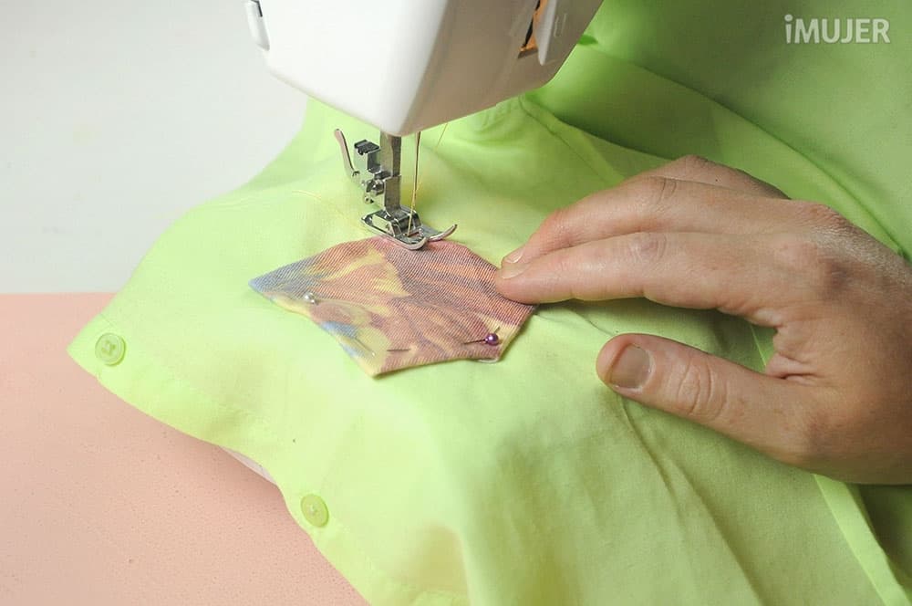 Y vuelve a utilizar la máquina para coser el bolsillo a la camisa. Saca de a poco los alfileres.