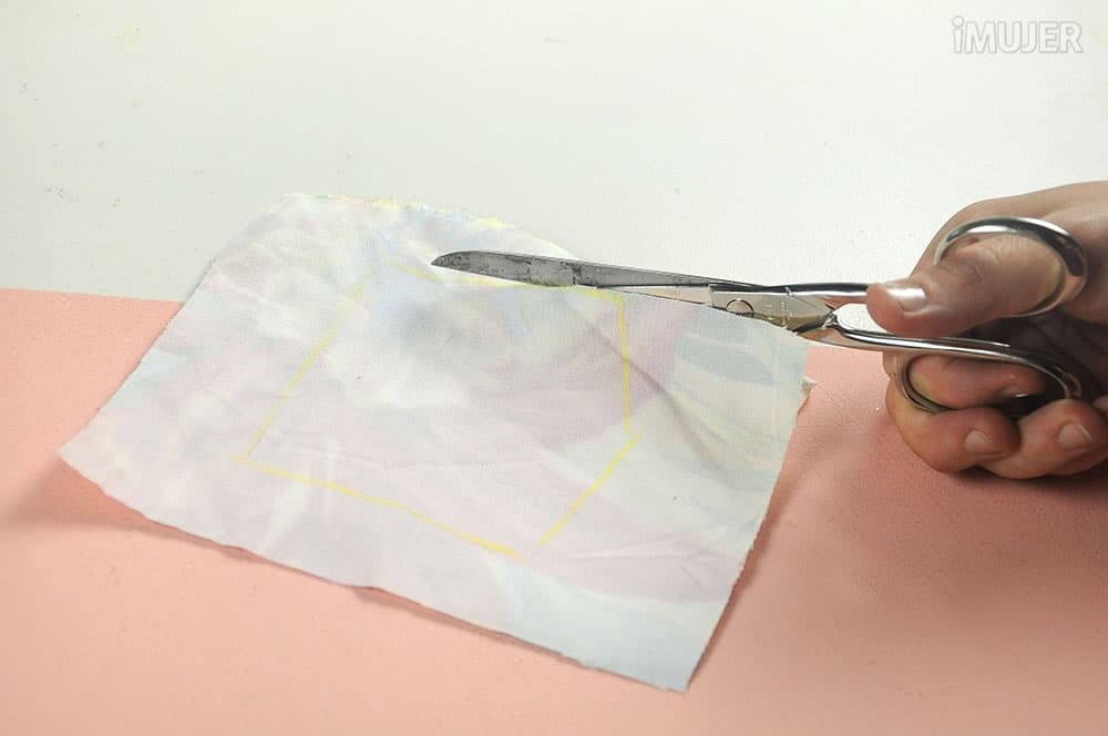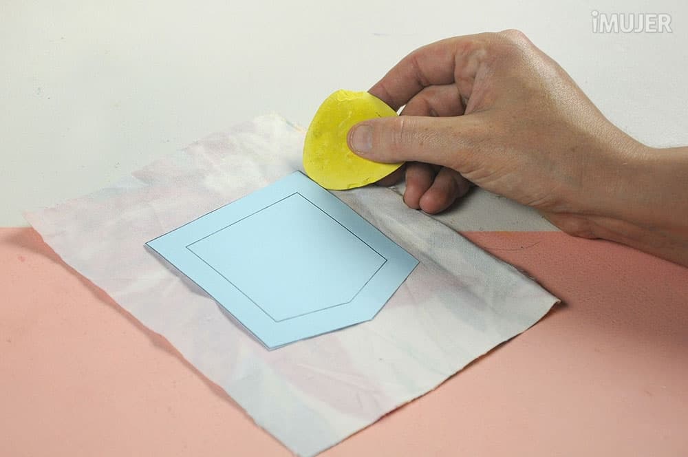 Comienza dibujando el molde del bolsillo en cartulina. Luego cólocalo sobre la tela estampada del revés y dibuja su contorno con la tiza.