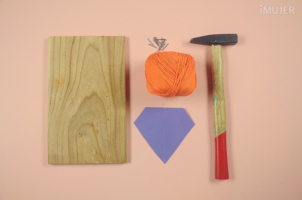 Coloca el molde de diamante sobre la madera y sujétalo con los clavos. Clava uno en cada vértice y forma el diamante con los 8 clavos como se muestra en las imágenes.