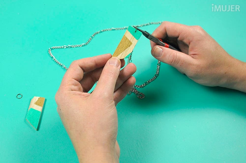 Con la pinza engancha la cadena en el orificio y tendrás tu collar listo.