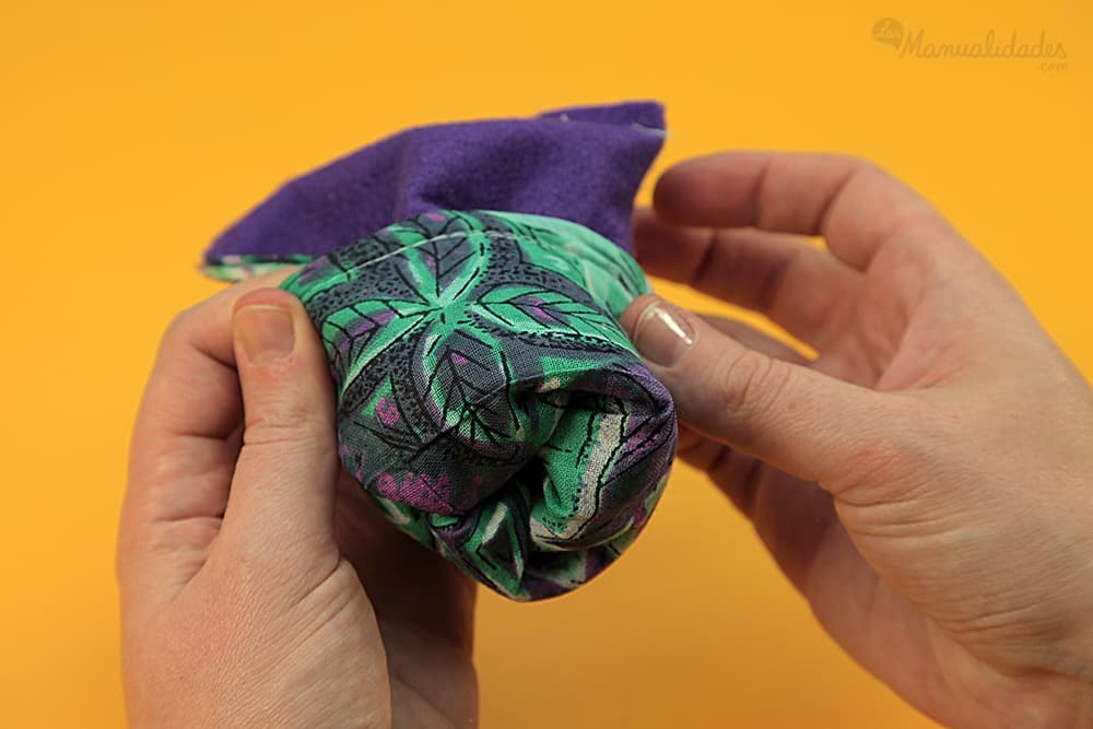 Para acabar, damos la vuelta a nuestra funda, escondiendo la parte de algodón y dejando la tela estampada en la superficie. ¡Y ya tenemos lista nuestra funda casera!