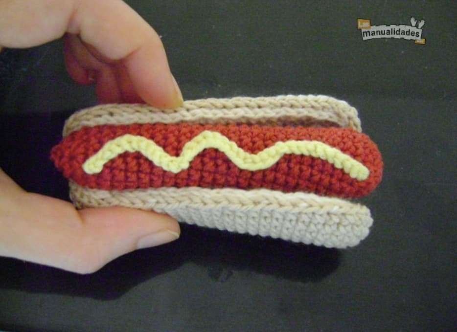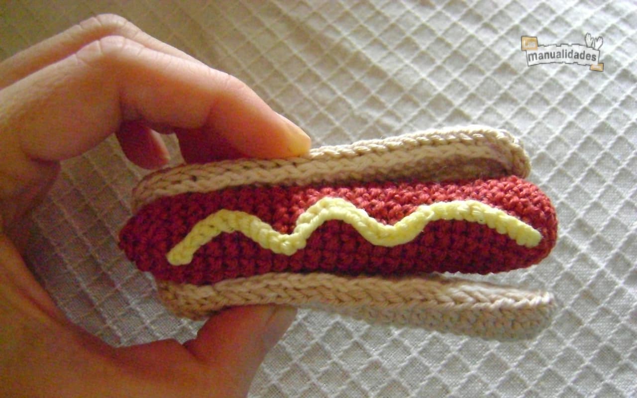 Con restos de hilo amarillo tejemos una cadeneta de 30 puntos y la unimos a la salchicha formando ondas, como si fuera la mostaza. Si no tenéis lana amarilla, pero sí roja, podéis hacer exactamente lo mismo y hará el efecto de ketchup.