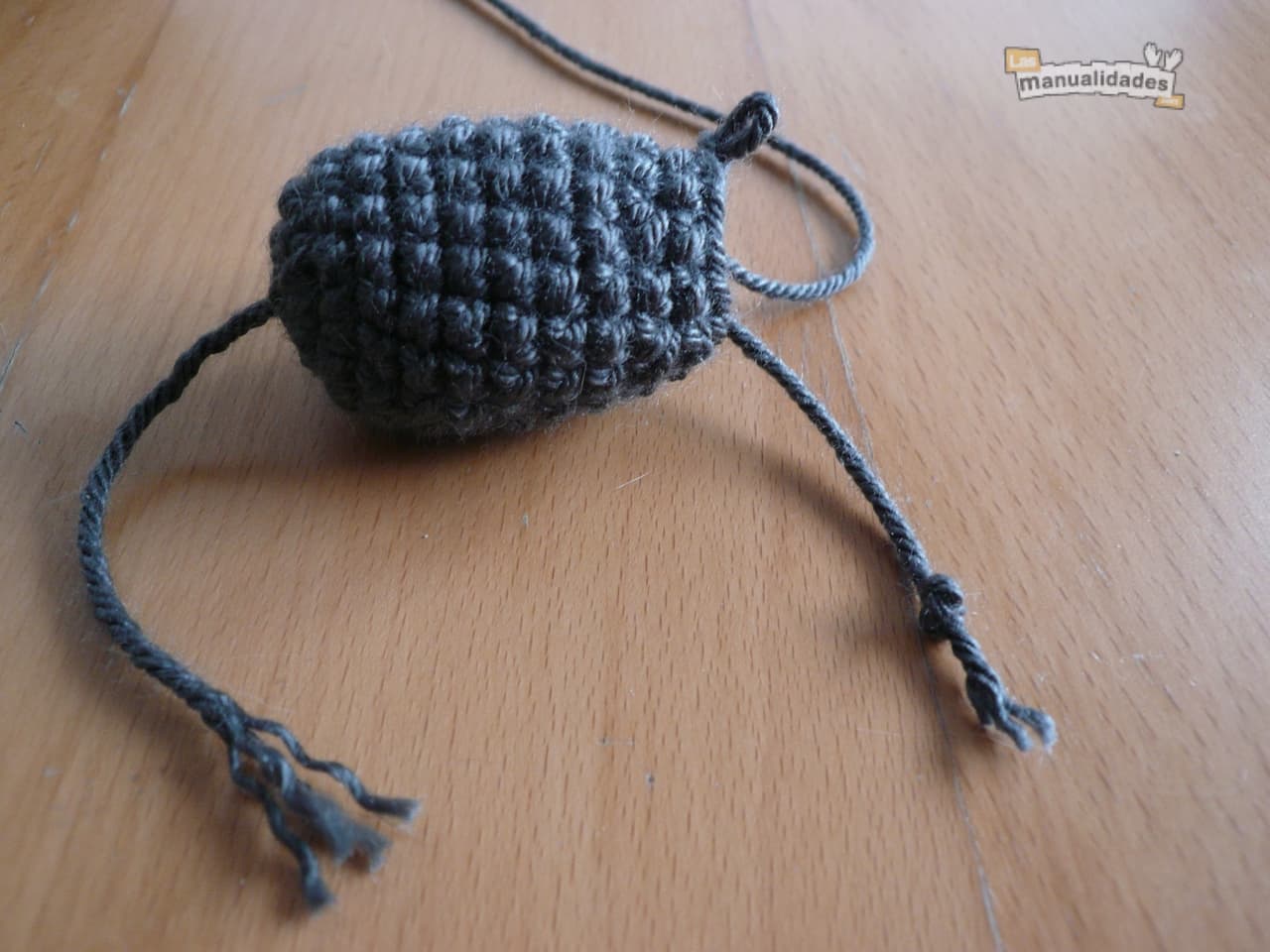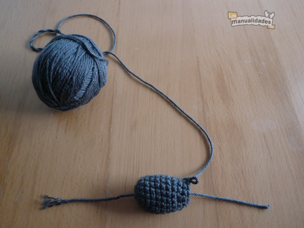 En el otro extremo de la lana hacemos un nudo grueso. Tiramos del lado sin anudar y ya tenemos la cola de nuestro ratón de amigurumi.
