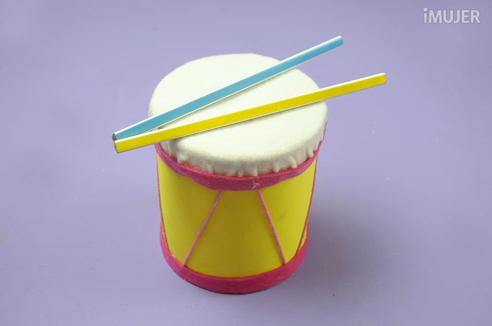 Por último, pega las dos láminas de fieltro, una en la parte superior y otra en la parte inferior del tambor.