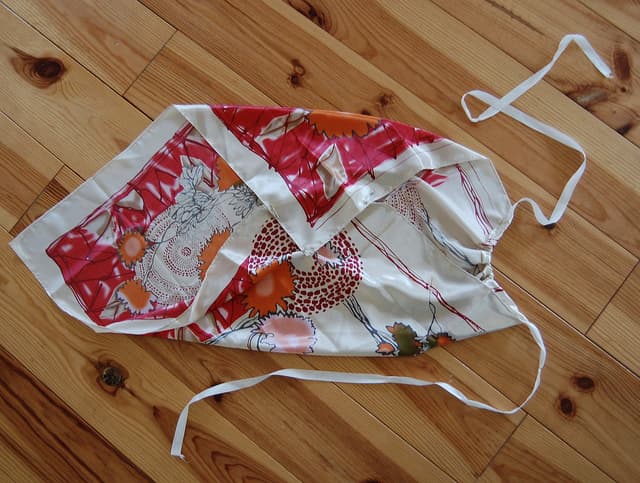 Cose en un vértice lateral un lazo y en el otro un trozo de cinta. Puedes, si lo prefieres, coser en ambos lados segmentos de cinta para anudar en la espalda.