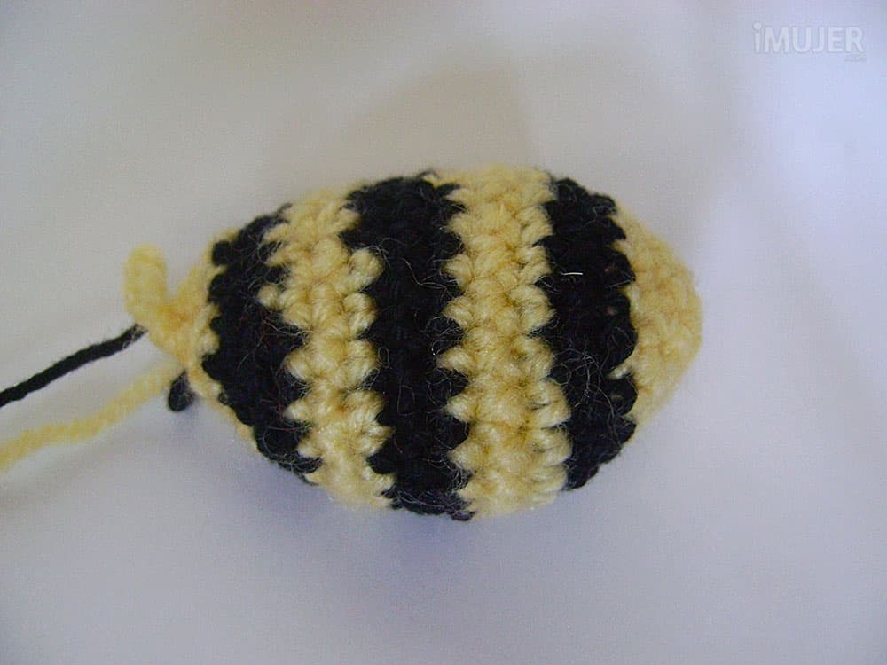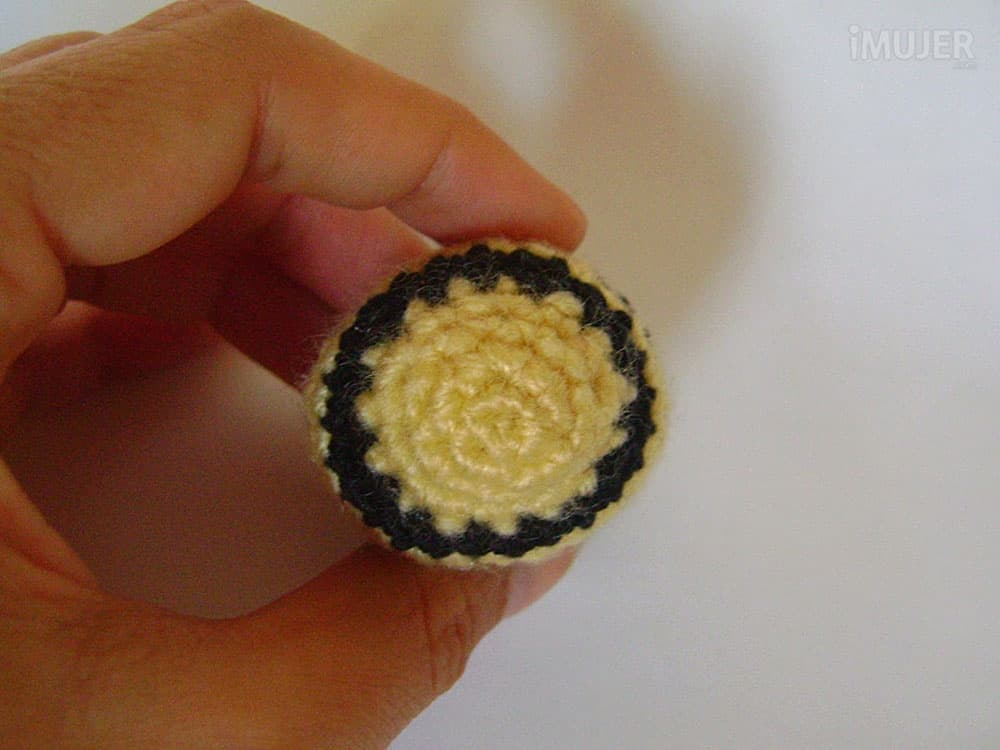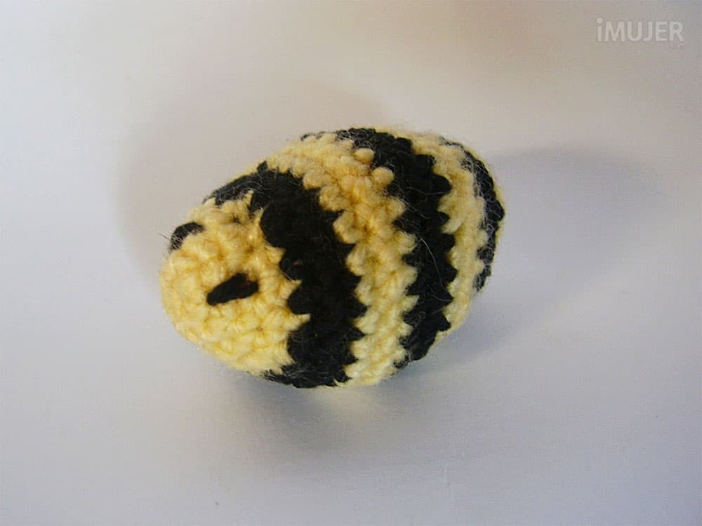 En uno de los extremos de la abeja de amigurumi hacemos los ojos. Bastará con dar un par de puntadas con hilo o lana negra.