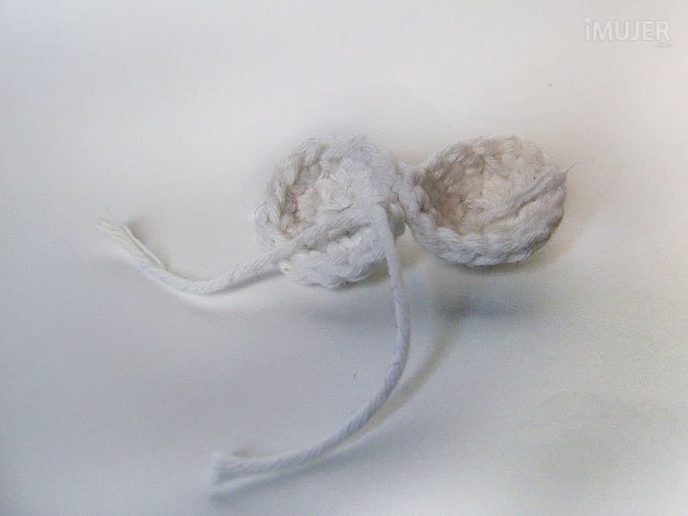 Vueltas 12 y 13, también en amarillo tejemos punto bajo en el primer punto y disminuimos en el siguiente, obtendremos 6 puntos en la primera vuelta y 4 en la siguiente. Rematamos.