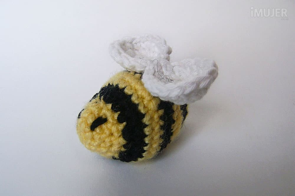 Ya sólo nos queda unir los dos elementos de la abeja de crochet. Coseremos las dos alas a la parte superior del cuerpo y... ¡ya está listo!