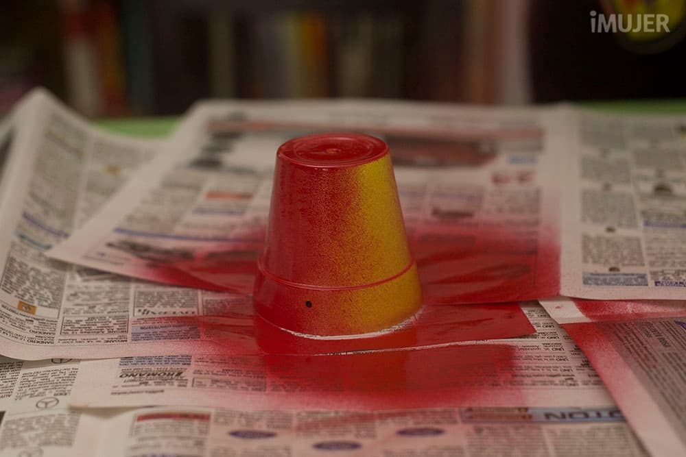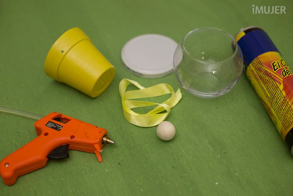 Coloca el vaso redondeado sobre la maceta y pégalo con la pistola de silicona.