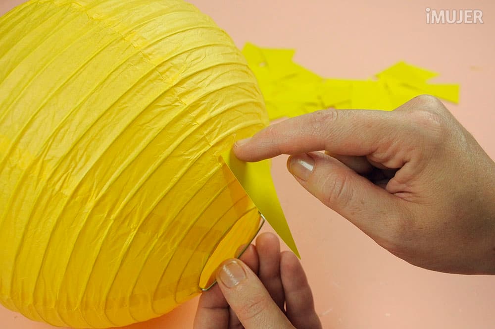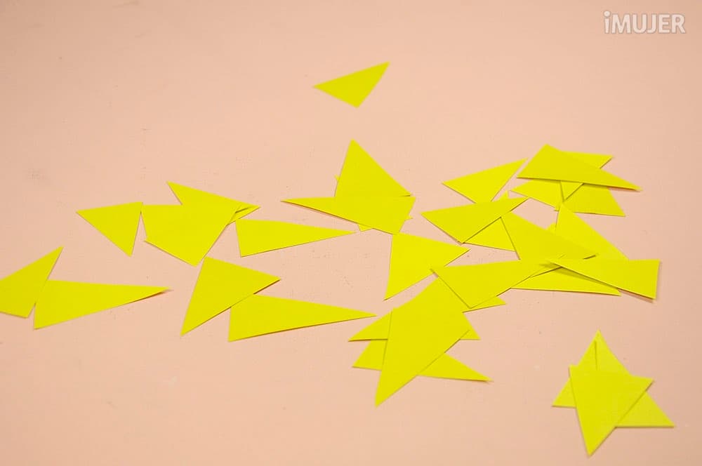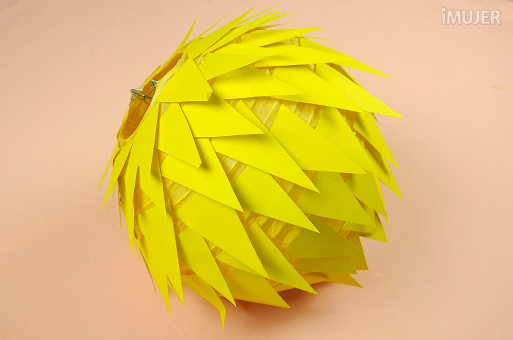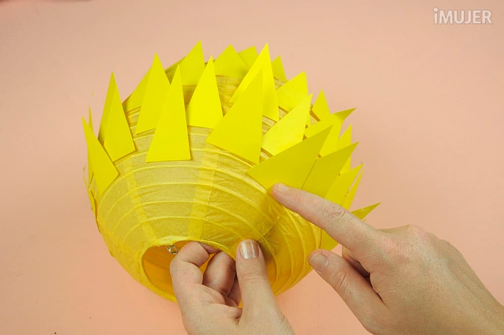 Uno a uno, coloca los triángulos de cartulina en la lámpara.