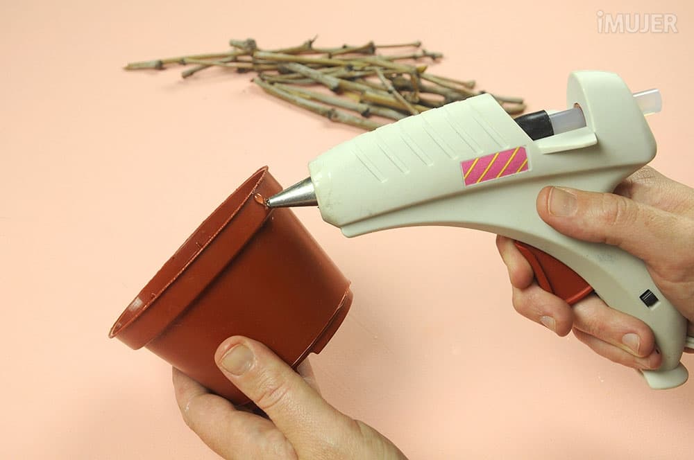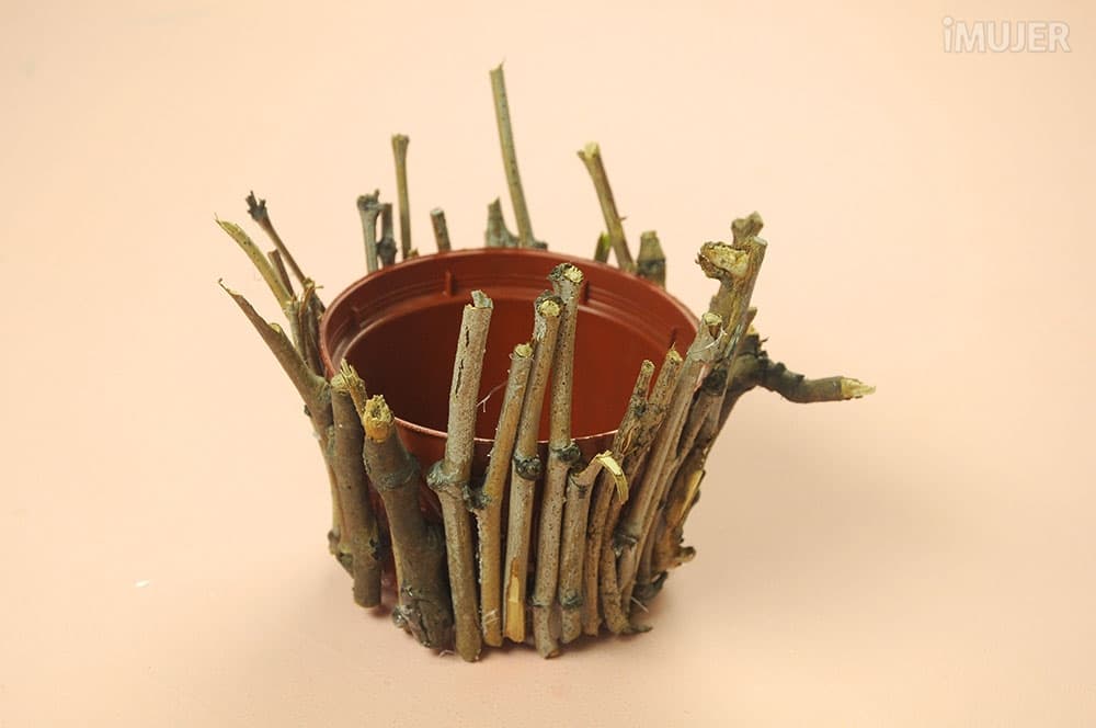Pega las ramitas sobre la maceta y cúbrela toda.