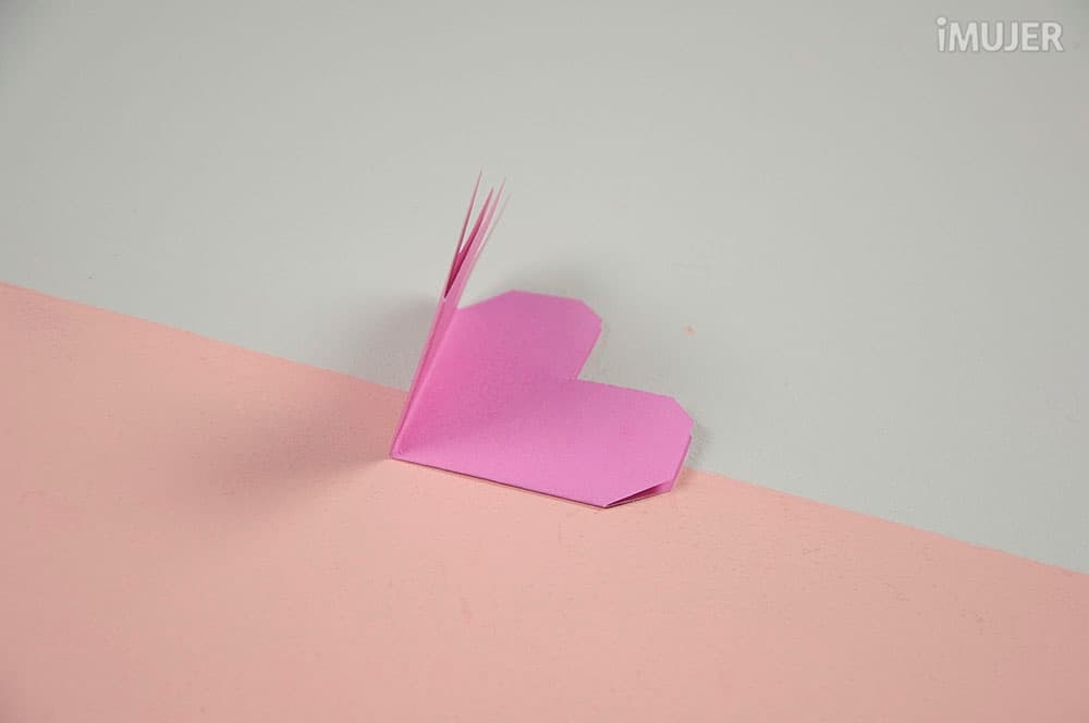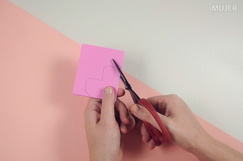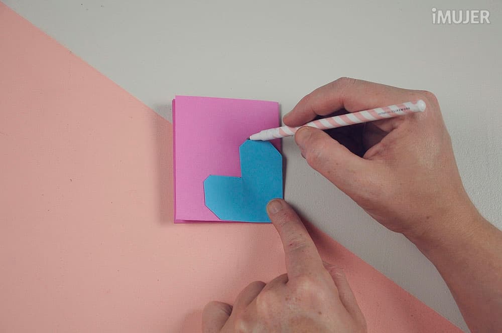 Coloca el molde de corazón justo en la esquina de la cartulina doblada y copia su silueta con el bolígrafo.