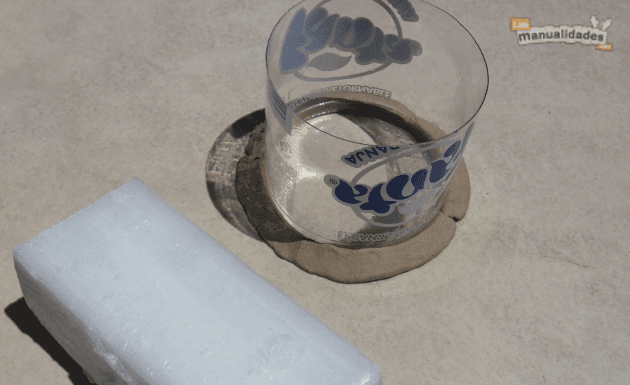 Para hacer el llenado más fácil, puedes sujetar el molde a la mesa con un poco de plastilina, pero si no tienes plastilina en casa simplemente tendrás que sujetar bien firme el molde cuando viertas dentro la parafina con arena.