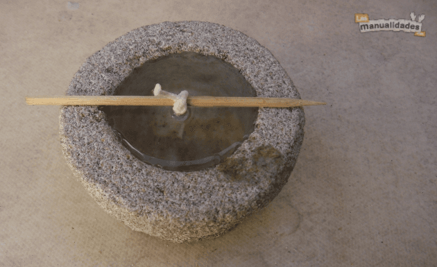 Caliente más parafina, ata el pabilo en un palito y colócalo sobre el borde. Luego rellena el contenedor con parafina.