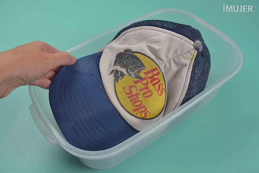 Coloca el sombrero dentro del recipiente plástico; asegúrate que quepa todo el sombrero dentro, ninguna parte puede quedar afuera.