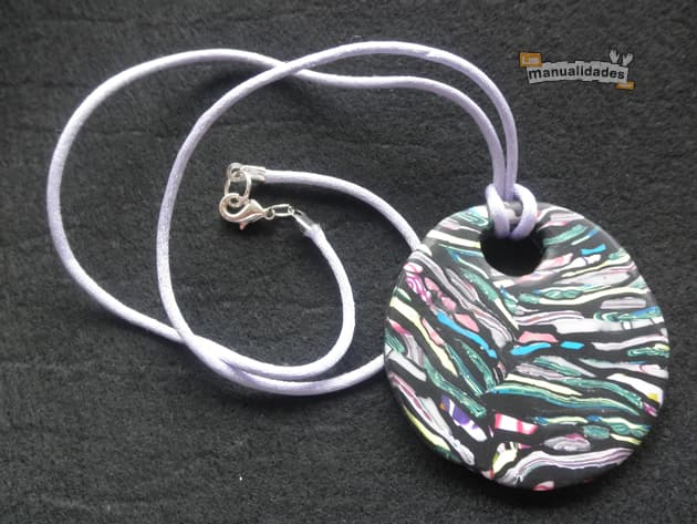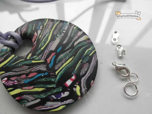 Y ya tenemos la pieza terminada, escojemos un color para nuestro cordón, que puede ser de cuero, de simil cuero, de cola de ratón (como en este caso), una cadena, etc. y un cierre.