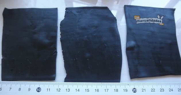Ahora necesitamos tres láminas de arcilla polimérica negra, pasadas por la máquina laminadora (o con el rodiilo), al número 3 (#3) para que sea finita.