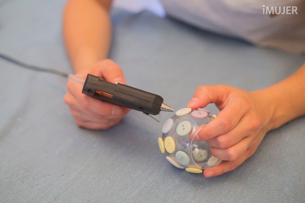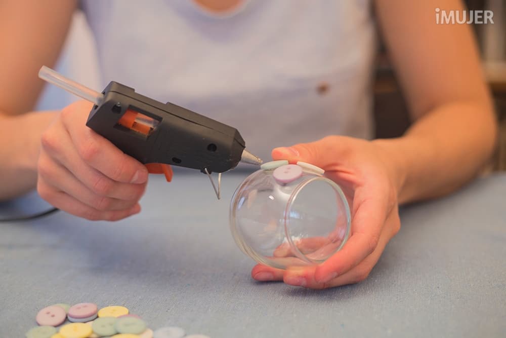 Coloca los botones en el vaso de vidrio con la pistola de silicona.
