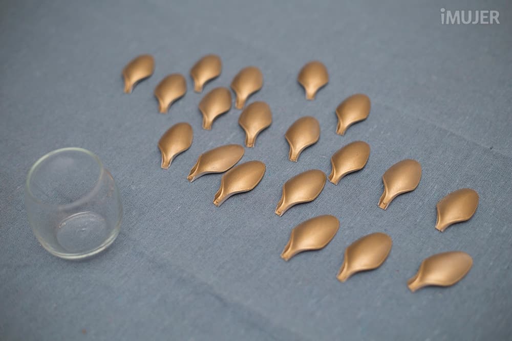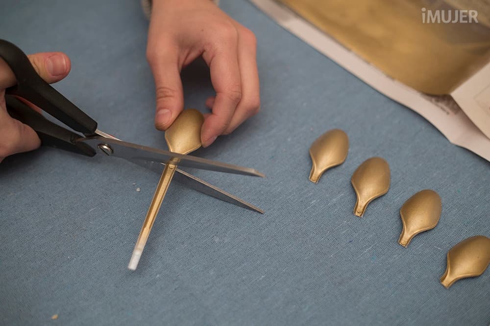 Con la tijera, corta el mango de las cucharas, solo necesitamos la parte superior.