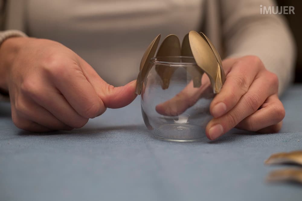 Desde arriba hacia abajo, coloca las cucharas en el portavelas con silicona.