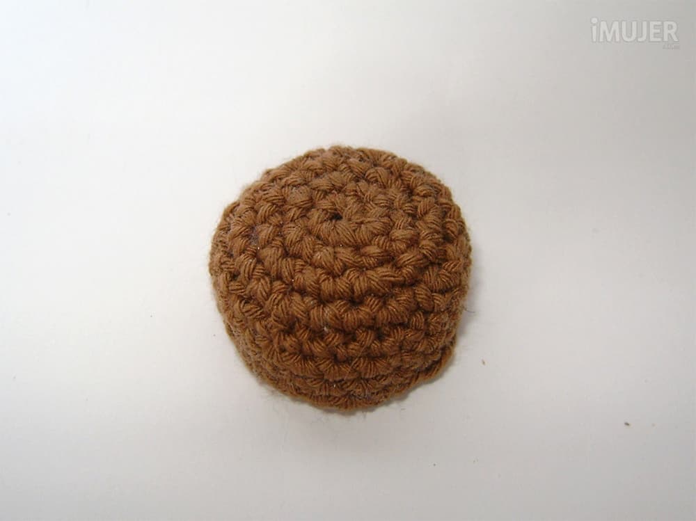 Volvemos a tomar la lana marrón y con ella tejemos un punto bajo en cada punto alrededor de la última fila de ese tono. Para conseguirlo, enganchamos la aguja de ganchillo a sólo una de las hebras de cada punto. Rematamos y éste será el resultado: