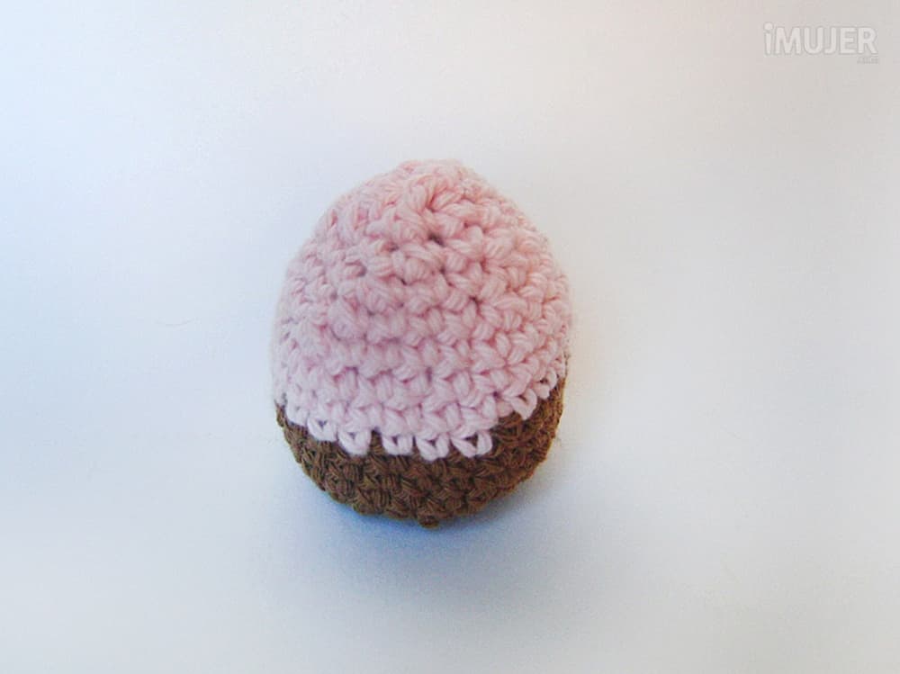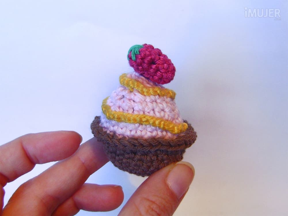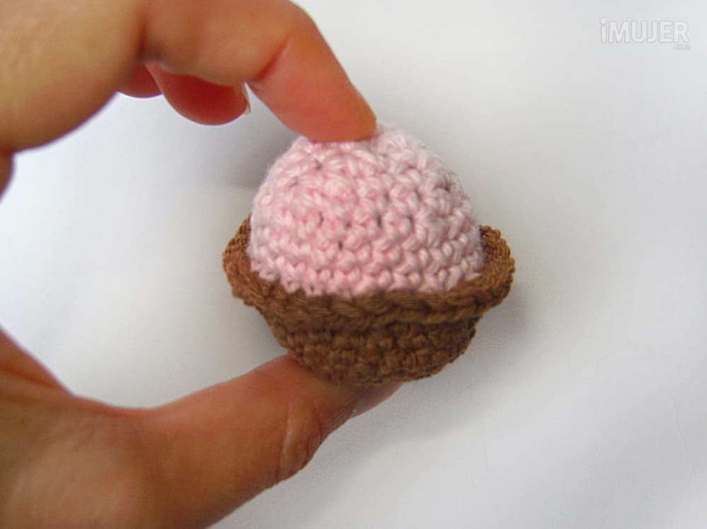 Unimos la pieza a nuestro cupcake de amigurumi con unas puntadas... ¡y ya está listo!