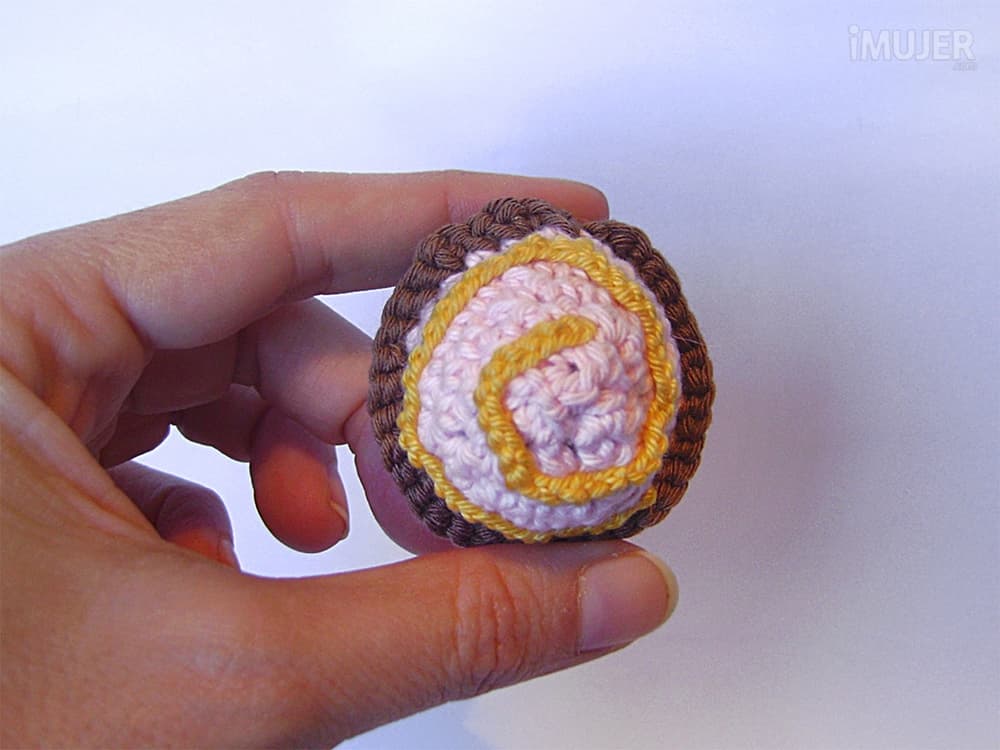 Con lana amarilla tejemos una cadeneta de 20 puntos. La cosemos a la parte rosa del cupcake de crochet, en forma de espiral. Así parecerá parte de la decoración del dulce.