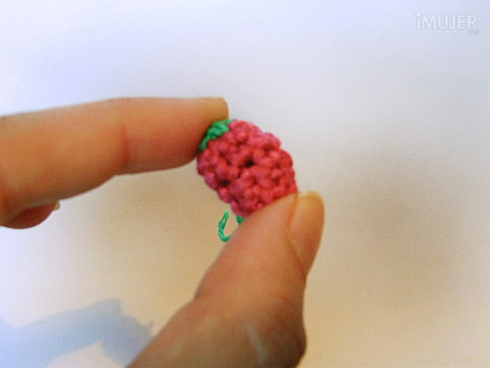 Con lana de color rosa oscuro haremos la última pieza: una fresa. Comenzamos haciendo un anillo mágico de 4 puntos.