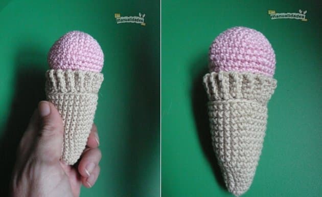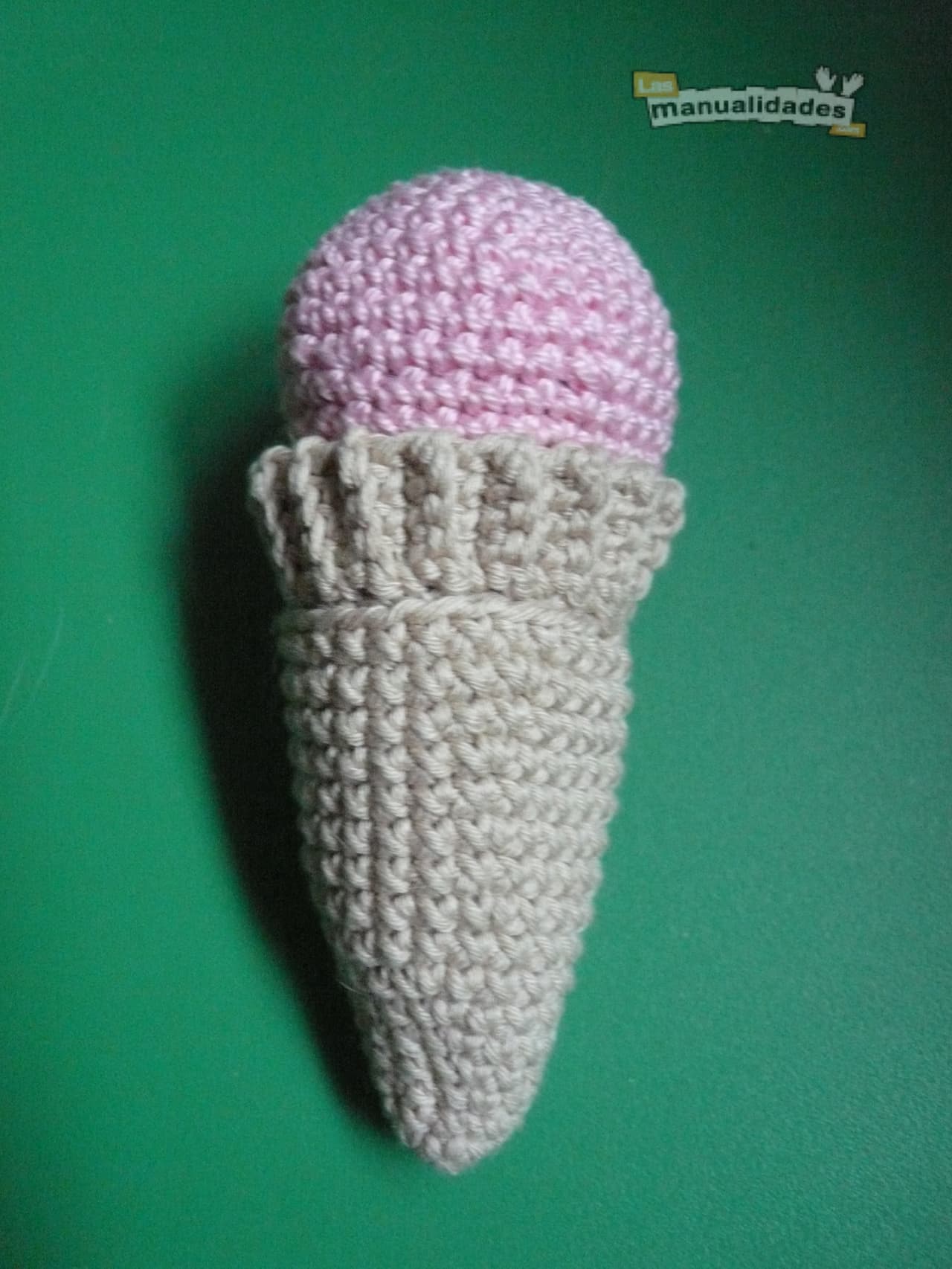 Y ya está listo nuestro cono de helado de ganchillo. Podéis tejer la bola de helado con el color de vuestro sabor preferido e incluso darle un toque personal añadiéndole una cereza o una fresa, también de ganchillo.