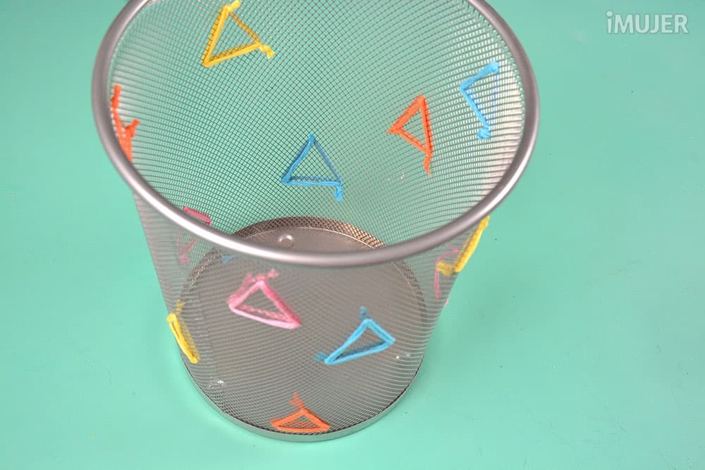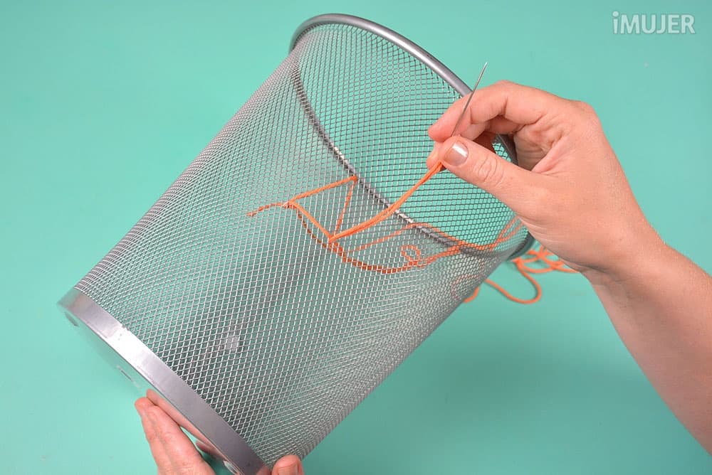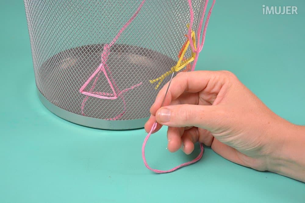 Usa la aguja para formar triángulos con el hilo en la papelera.