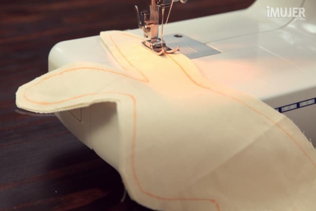 Deja una abertura de algunos centímetros en la zona inferior del conejo sin coser para poder introducir el relleno de algodón luego.