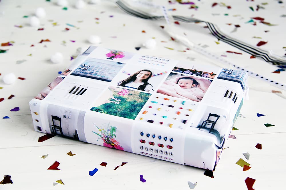 Nada de regalar un portaretratos con una foto. Inspírate y crea un papel con las fotos que tengas junto a la persona que lo va a recibir, y sorprende desde el comienzo con tu regalo.