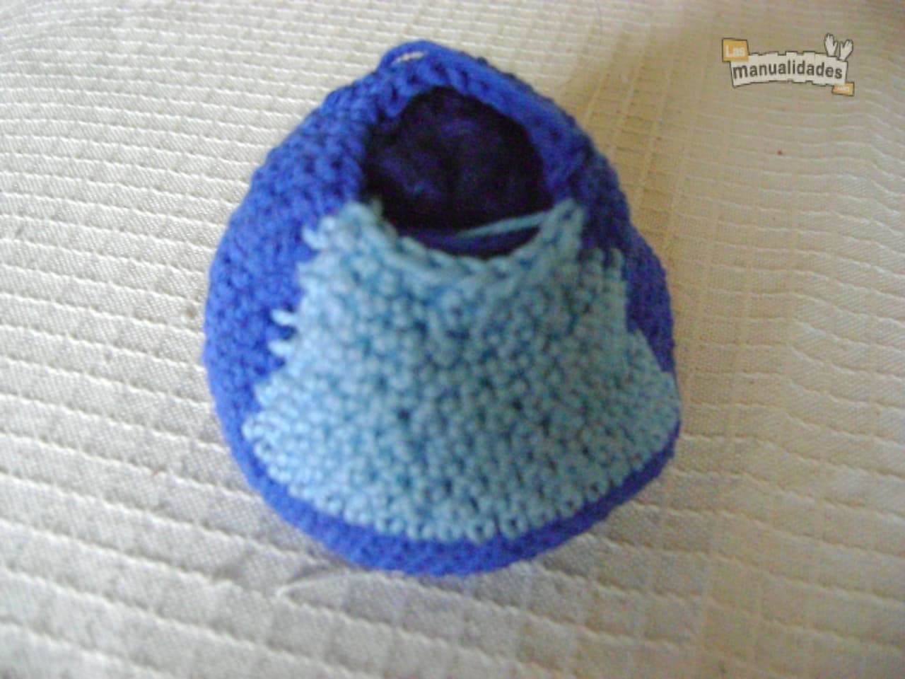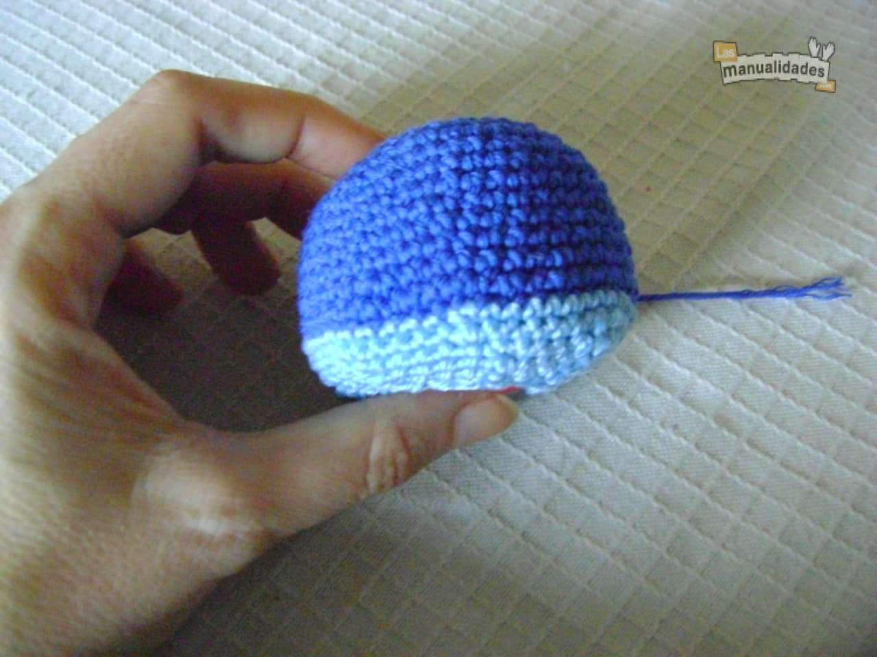 Para hacer este bonito muñeco de Stich en crochet necesitamos tejer varias piezas. Comenzamos con la que será la cabeza del muñeco, que tejemos en dos tonos de azul, la parte superior de la cabeza la hacemos con azul oscuro y la parte inferior en azul claro, así: