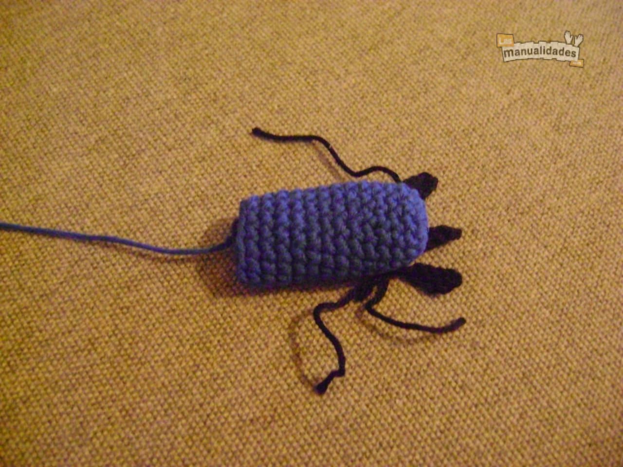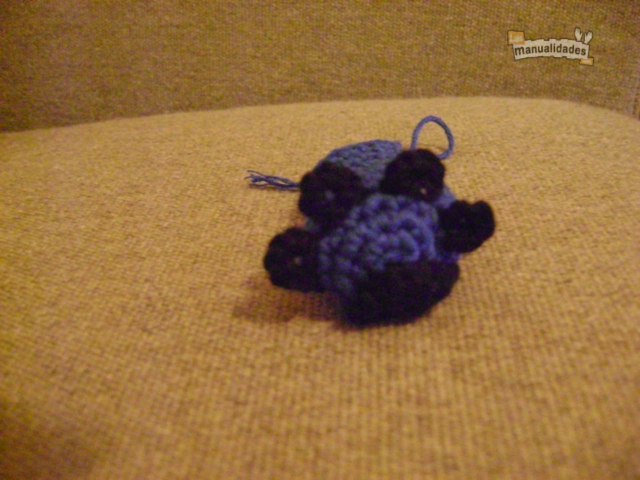 Los pies de nuestro Stitch de ganchillo también se realizan con lana azul oscuro. En negro se tejen tanto los dedos del pie como la base de la patita. Y el resultado final, una vez hemos cosido todos los elementos, es así: