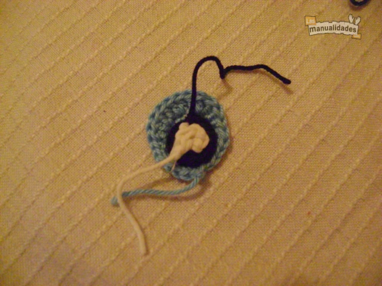 Por último, tejemos los ojos. Están formados por tres piezas. La más grande se hace con lana azul celeste. En negro tejemos la base del ojo y en blanco el iris.
