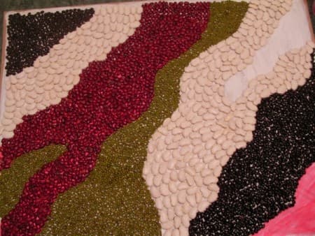 Crea el diseno una vez que esté seca la pintura. Coloca pegamento sobre el area a decorar y ve colocando las semillas, variando el color y la forma de las mismas.