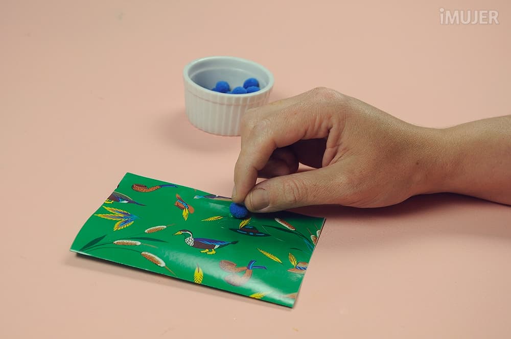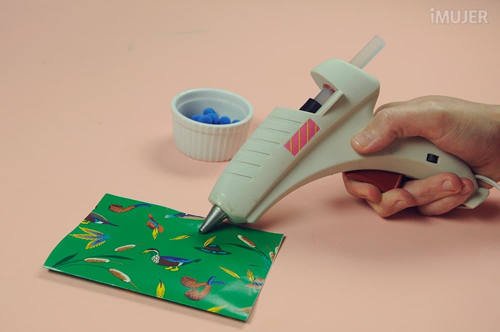 Cuando ya tengas la forma de la bolsa pega los pompones con silicona.