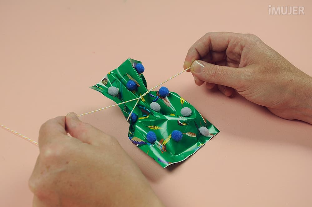Deja secar y cuando esté listo coloca dentro el regalo. Luego, cierra la bolsa con hilo.