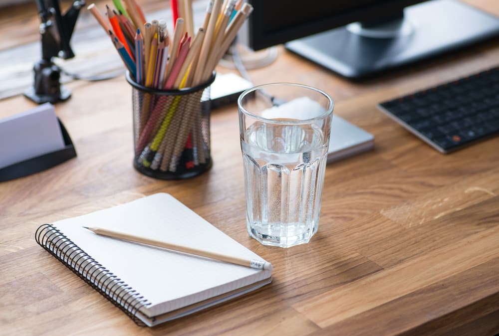 Para tenerla presente en el trabajo, puedes colocar una pequeña fuente o tener siempre un vaso con agua en tu escritorio.