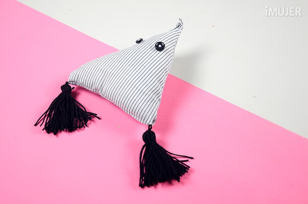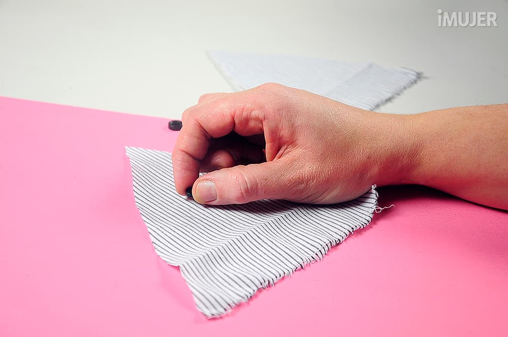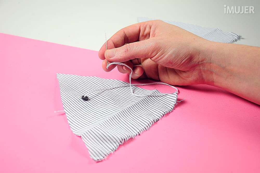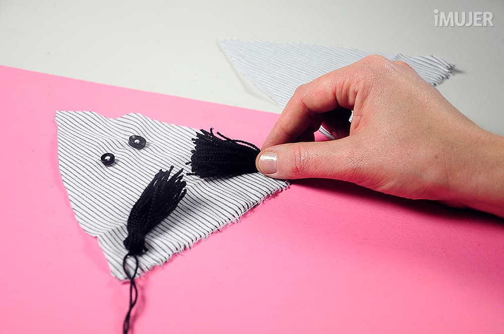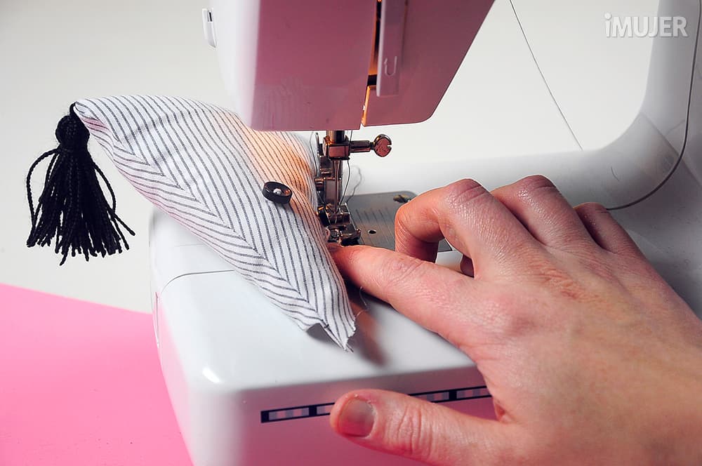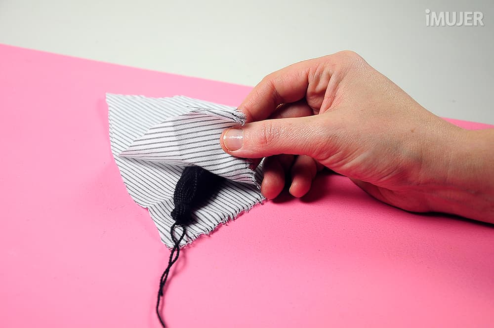 Luego, coloca las borlas en los laterales inferiores mirando hacia adentro. Pon el otro triángulo de tela encima y cóselo.