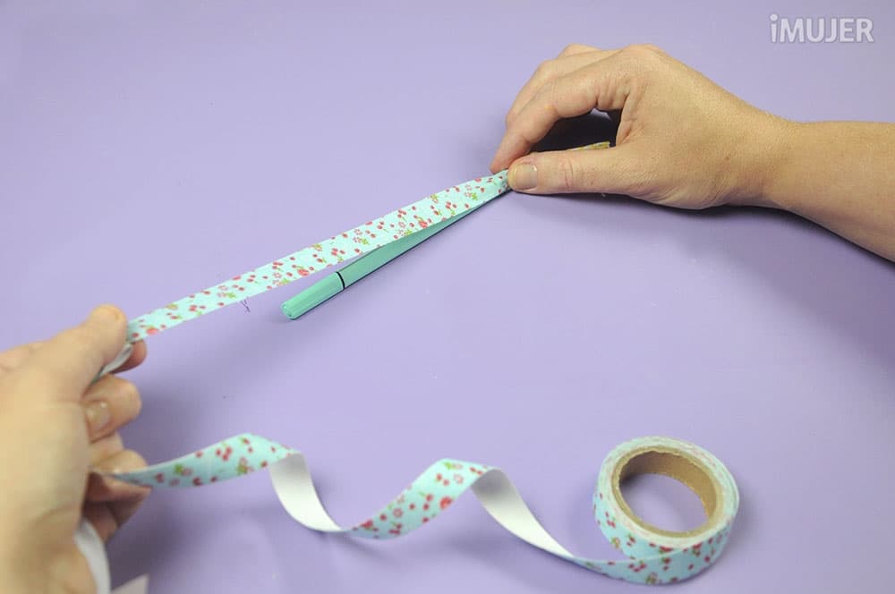 Luego, toma la washi tape y pégala de un extremo a otro hasta cubrir el bolígrafo por completo.