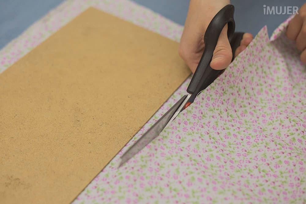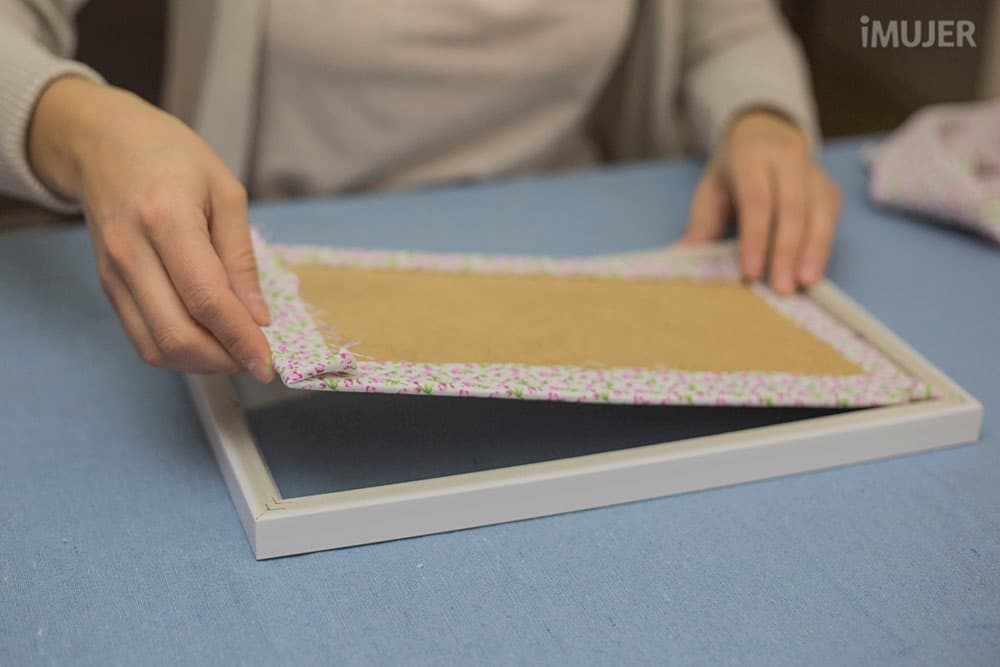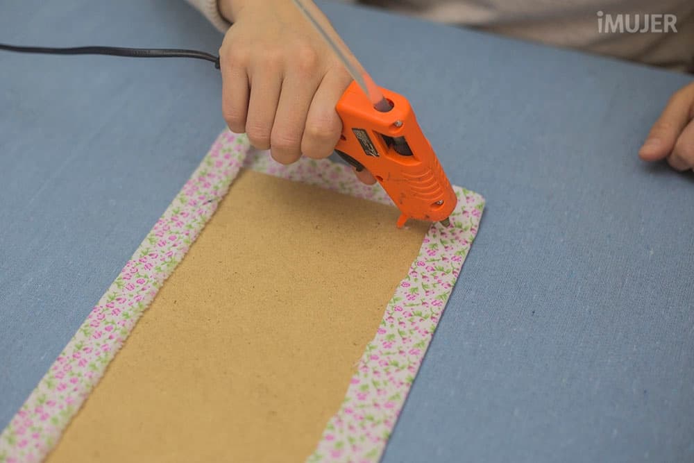 Ahora, con la pistola de silicona pega la tela por el lado trasero del portaretratos.