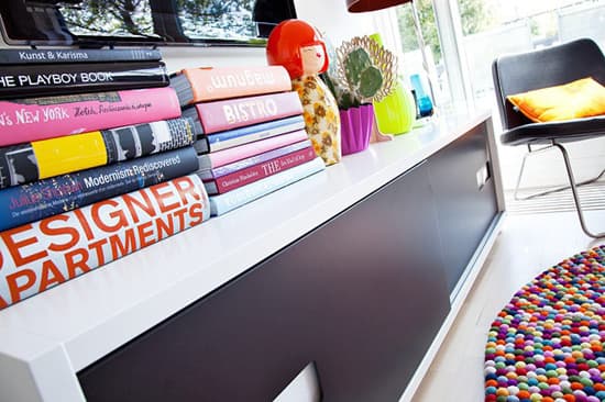 Sobre algunos de sus muebles pueden apreciarse una gran cantidad de libros colocados de forma horizontal, algunos con diseños muy peculiares. Se ha logrado una combinación espléndida entre libros rosas, negros, blancos, casi haciendo juego con la alfombra.