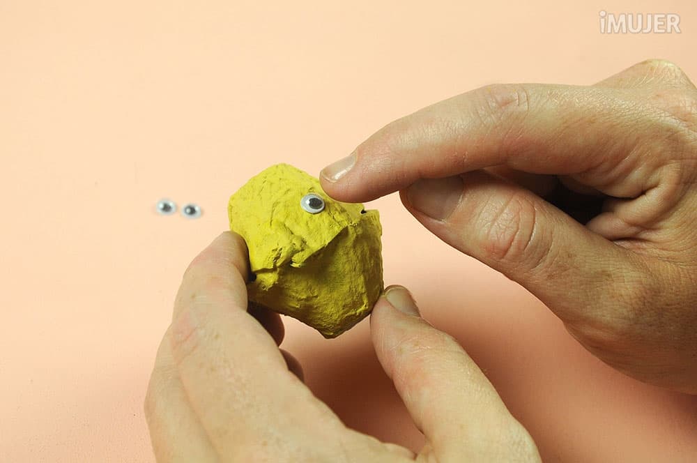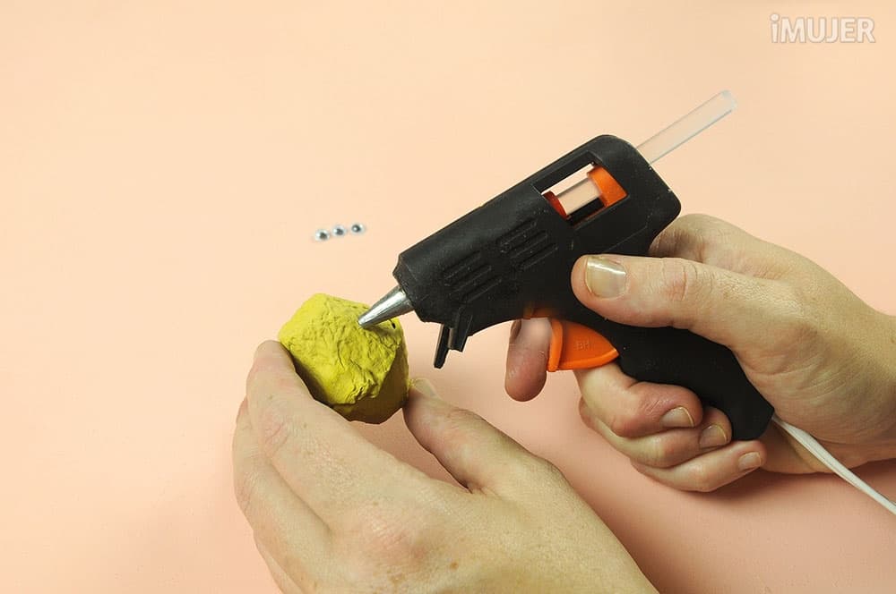 Cuando la pintura esté totalmente seca pega los ojos de plástico con silicona.