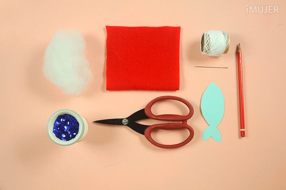Con el molde recortado, marca el contorno del pez sobre el retazo de fieltro. Luego dobla la tela por la mitad y recorta por la línea marcada. De esta forma tendrás dos moldes en un sólo paso.