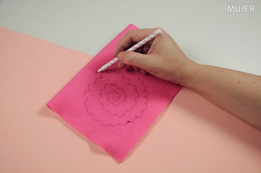 Comienza por dibujar un espiral de líneas onduladas en le fieltro rosa.