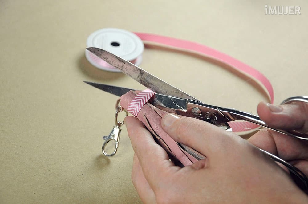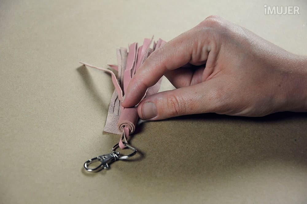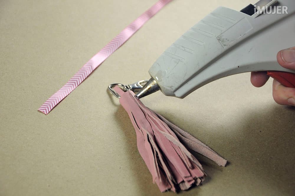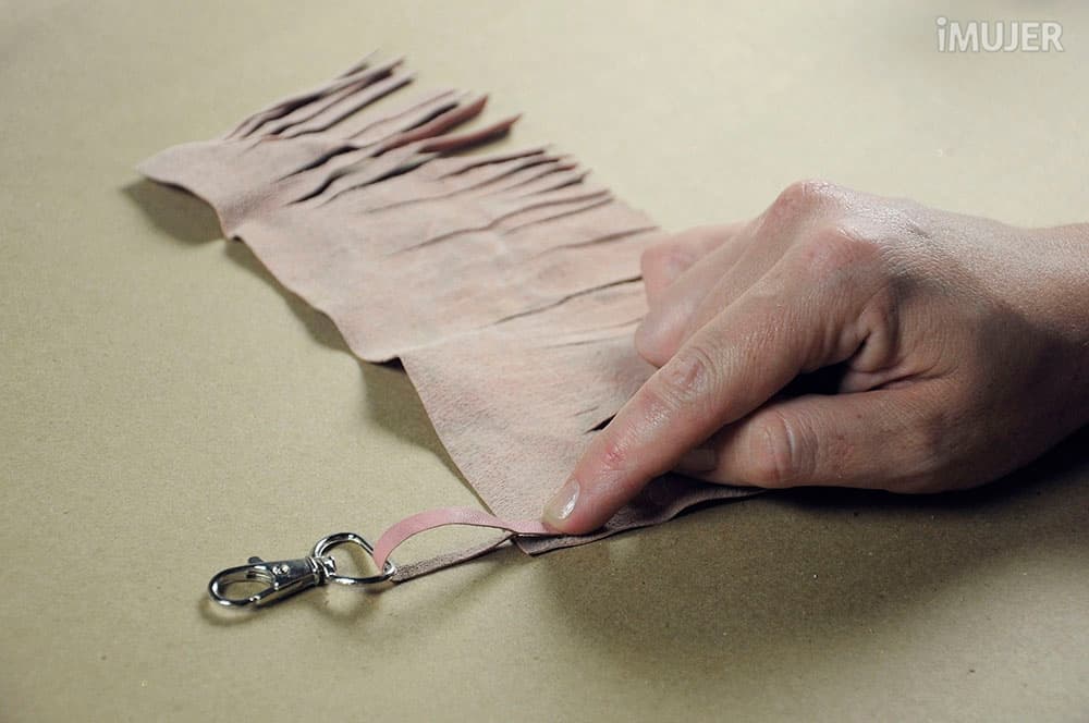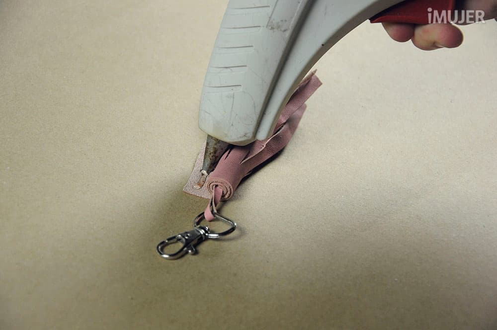 Coloca la tira de cuero con el gancho de resorte y pégala sobre la silicona.