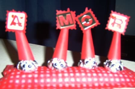 Se pega cada chocolate a lo largo de la almohadilla con cinta o si se cuenta con silicon. Al final se pone en la punta de cada sombrerillo la frase o las estampas pequeñas que se escogieron. Y queda un lindo detalle listo para regalar.